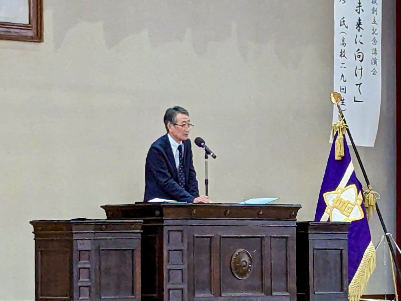 今年度の創立記念講演会は、講師に川上和彦氏をお招きし「君達の果てしない未来に向けて!」というテーマでご講演いただきました。講師は、高校29回生でバレー部の主将も務められました。